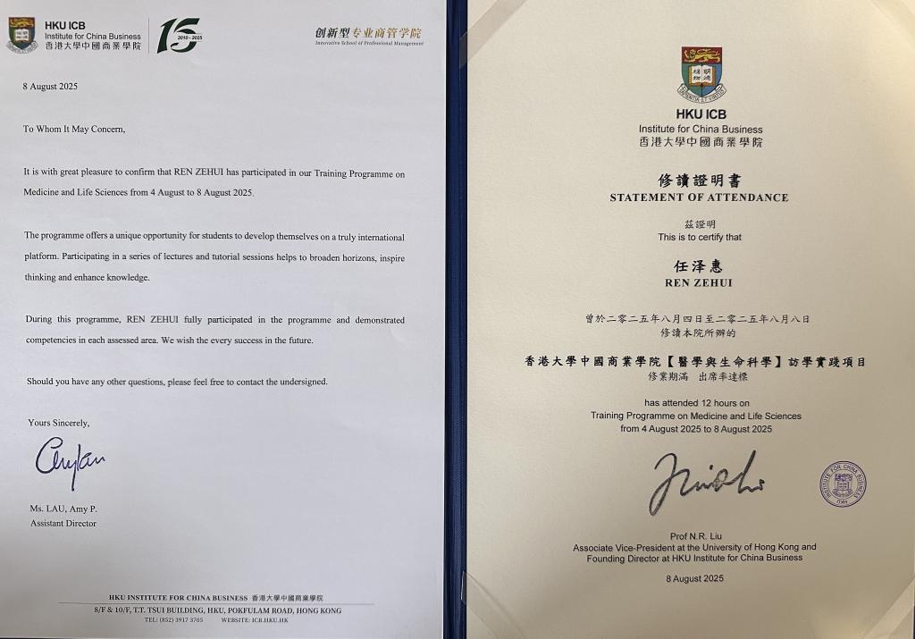 2025年8月3日至9日,我校学生任泽慧赴港参与香港大学主办的医学与生命科学访学项目,历经7天专业学习与文化体验,顺利获得香港大学颁发的结业证书。