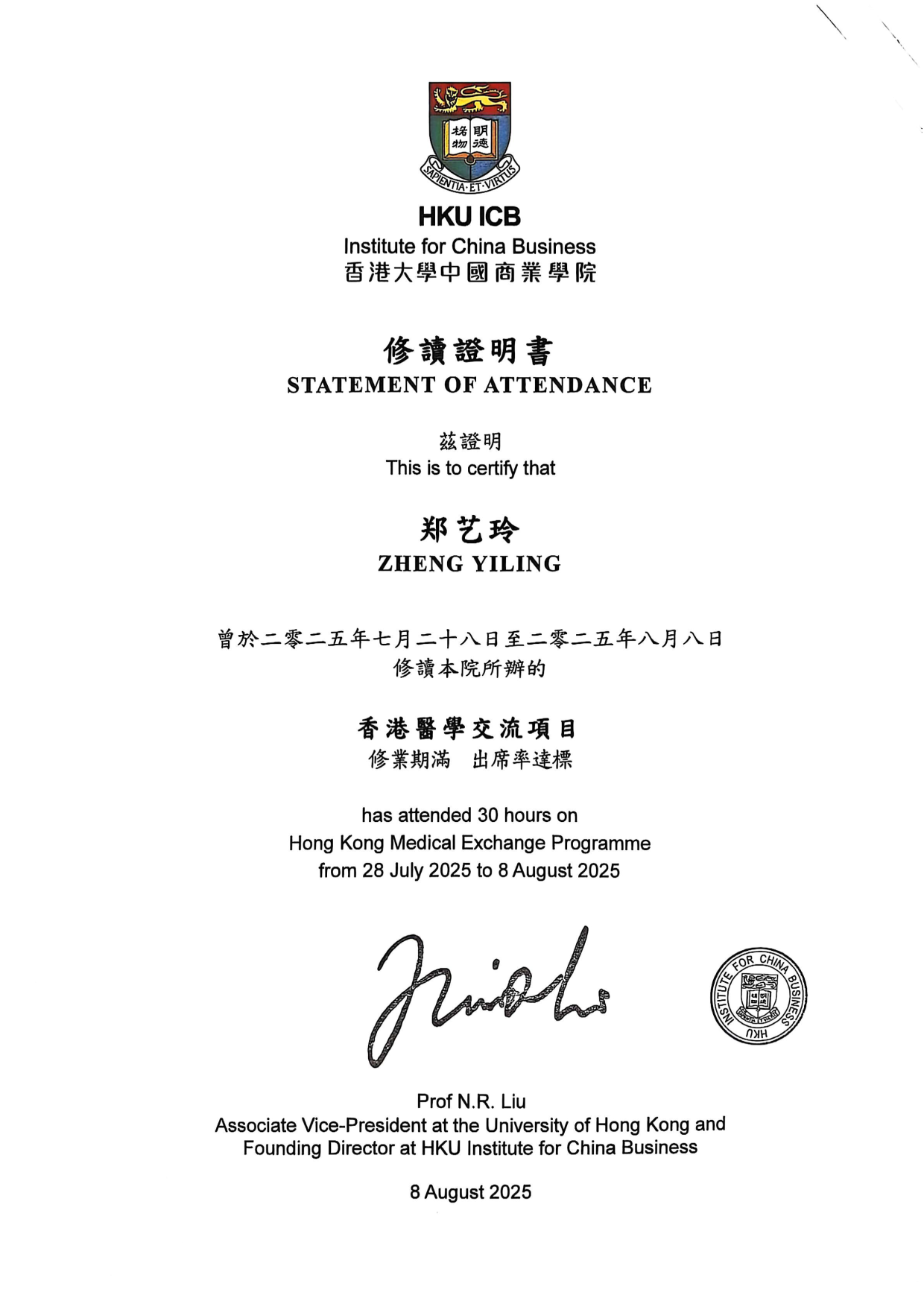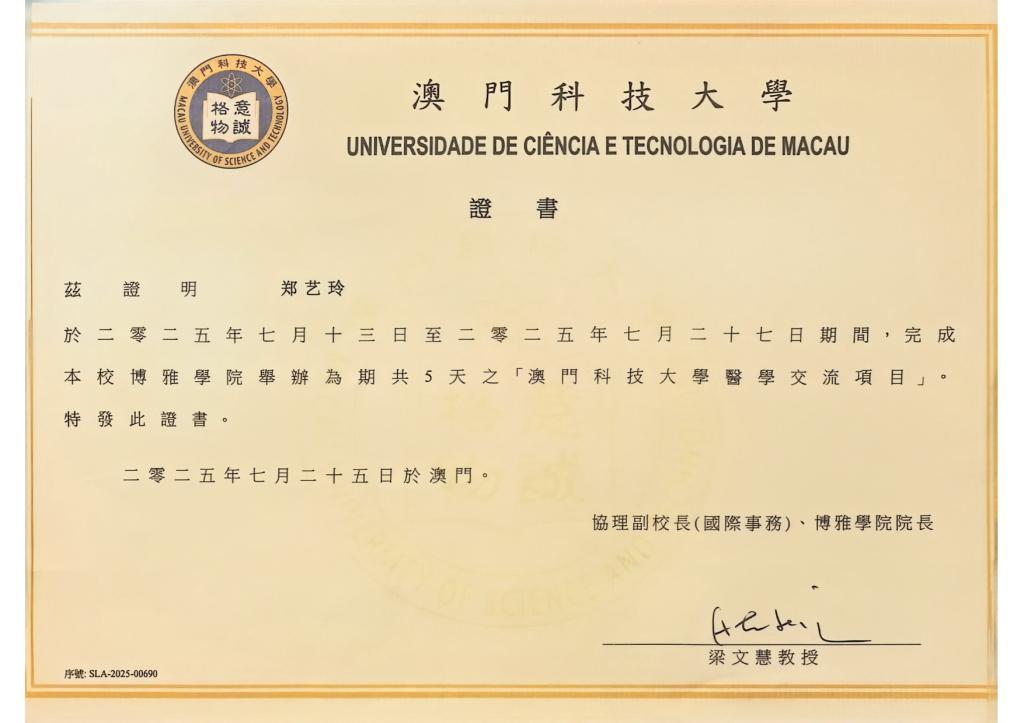2025年7月13日至8月10日,我校学生郑艺玲成功入选由澳门科技大学与香港大学联合主办的“2025年暑期港澳四周医学生访学交流项目”,在为期一个月的学习与实践中,深度对接港澳优质医学教育资源,全方位提升专业素养与综合视野。