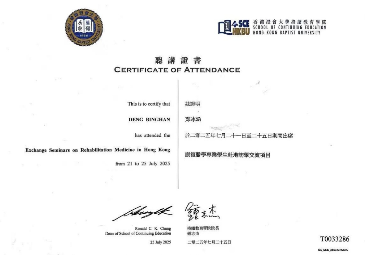 2025年7月20日至26日,我校学生邓冰涵赴港参加香港浸会大学主办的康复医学专业访学交流项目,经7天专业学习与文化体验,顺利获颁结业证书。