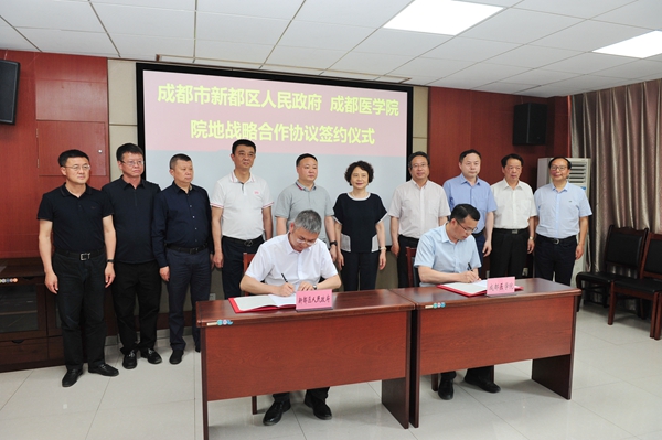 吴桐与王计生代表双方签订创建医科大学战略合作协议,许兴国、余小平、樊均明等见证签约。协议明确新都区将全力支持学校创建医科大学,支持第一附属医院迁建工程,整合区内医疗卫生资源构建北部区域医学中心。