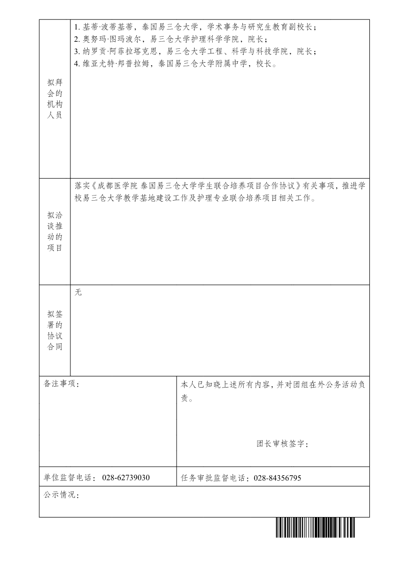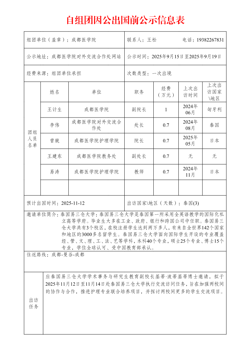 自组团因公出国前公示信息表(王计生等5人赴泰国执行交流访问任务)