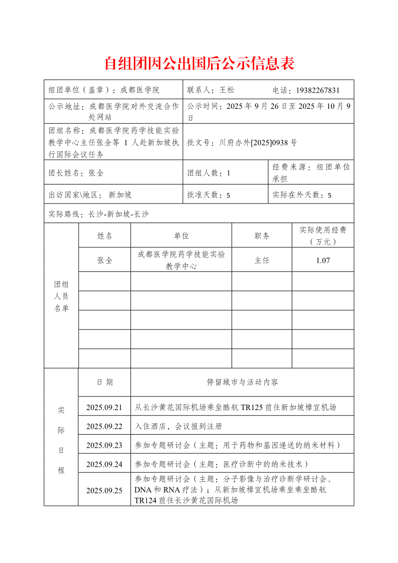 自组团因公出国后公示信息表(张全赴新加坡参加国际会议)