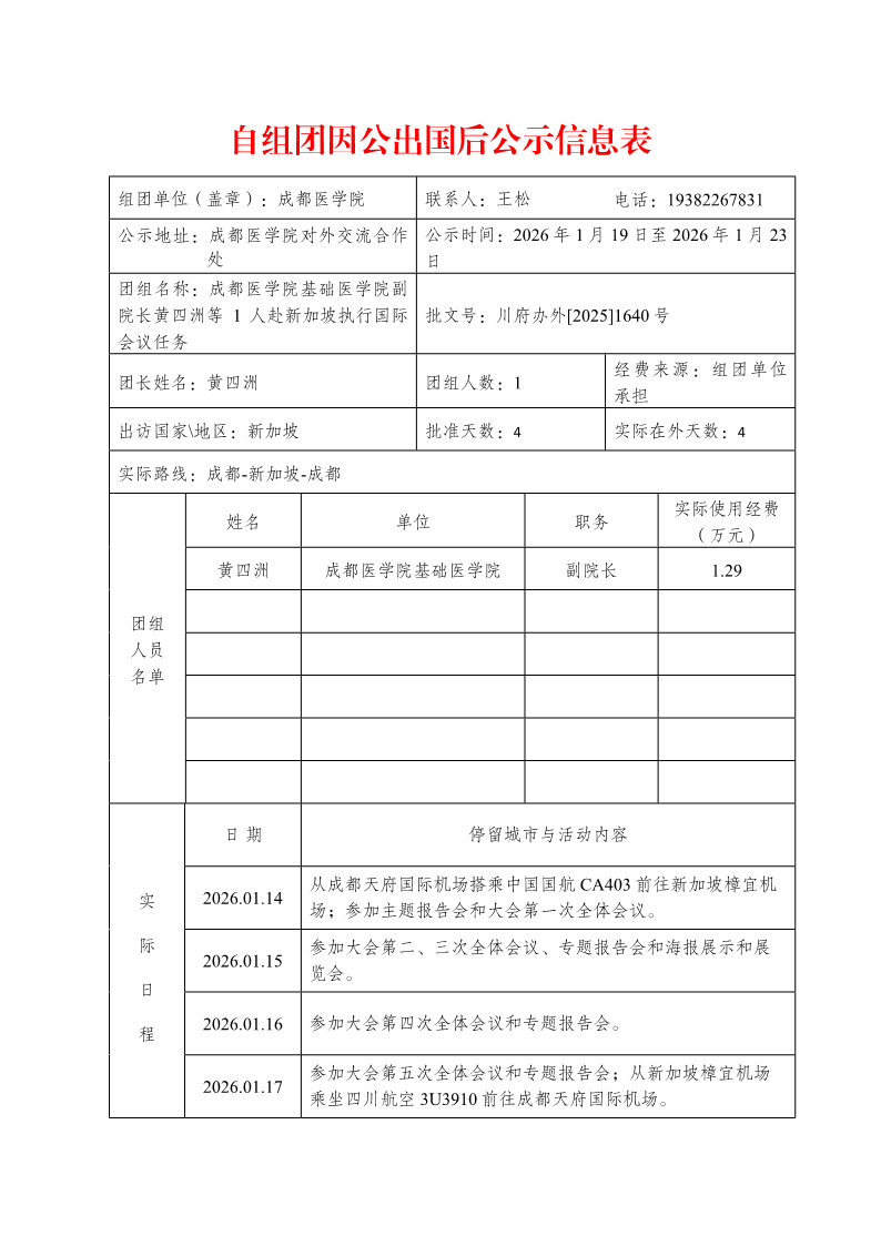 自组团因公出国后公示信息表(黄四洲赴新加坡参加国际会议)
